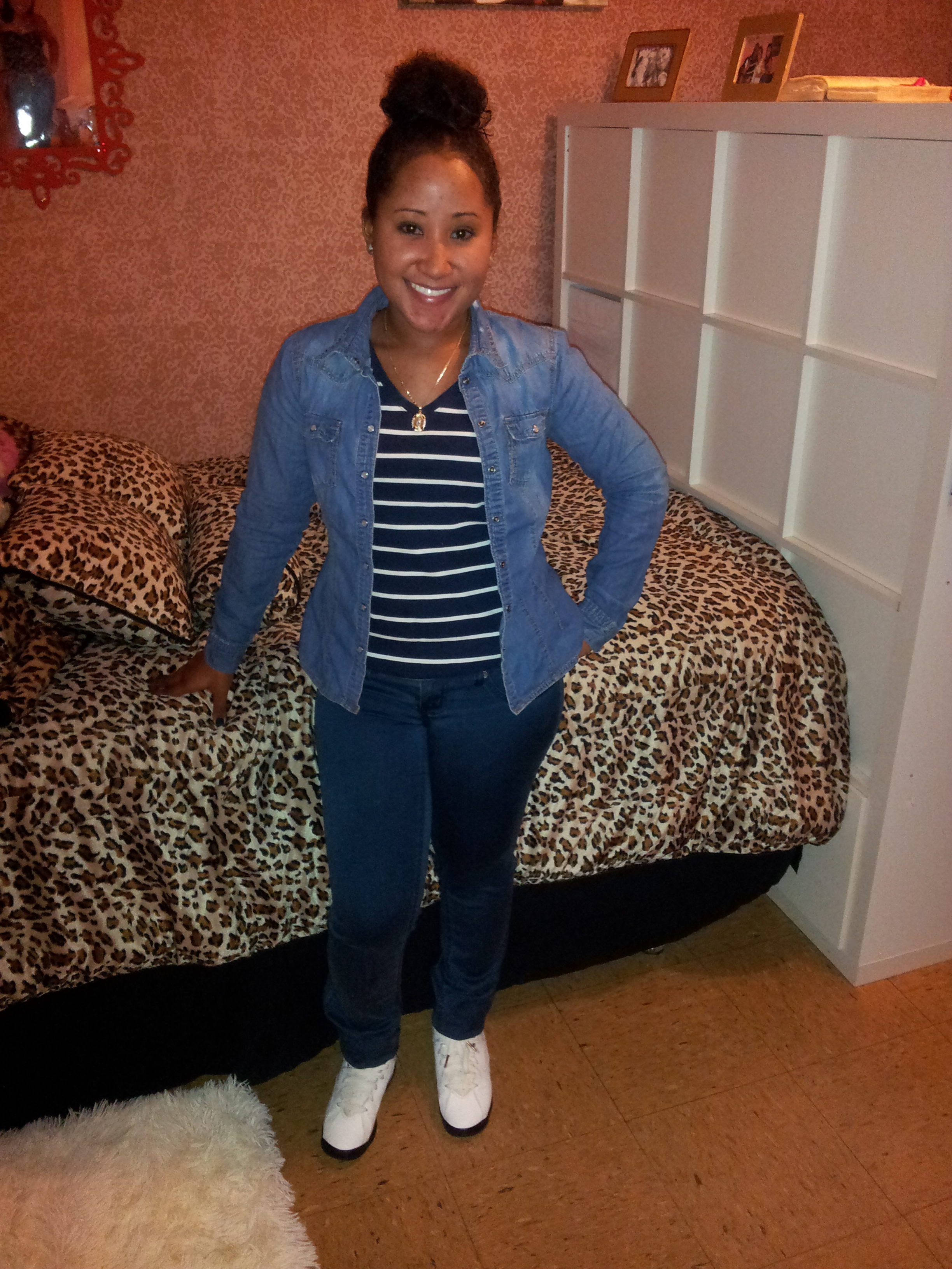 The jeans I wore are stretch, they are very comfortable. Because the jeans are blue I decided to wear my lighter H&M denim shirt. I do not like to match the color of my denim shirt to my jeans. It’s too matchy matchy for me. Wearing the same color on top and bottom is kind of infantile, reminds me of something I would wear in the 5th grade. I chose the blue Nautica shirt because I couldn’t find a white one but this shirt worked fine because the white stripes complement the sneakers. If I wore all blue the sneakers would stand out too much and it wouldn’t tie in with the outfit.