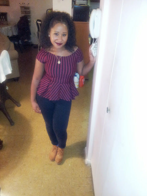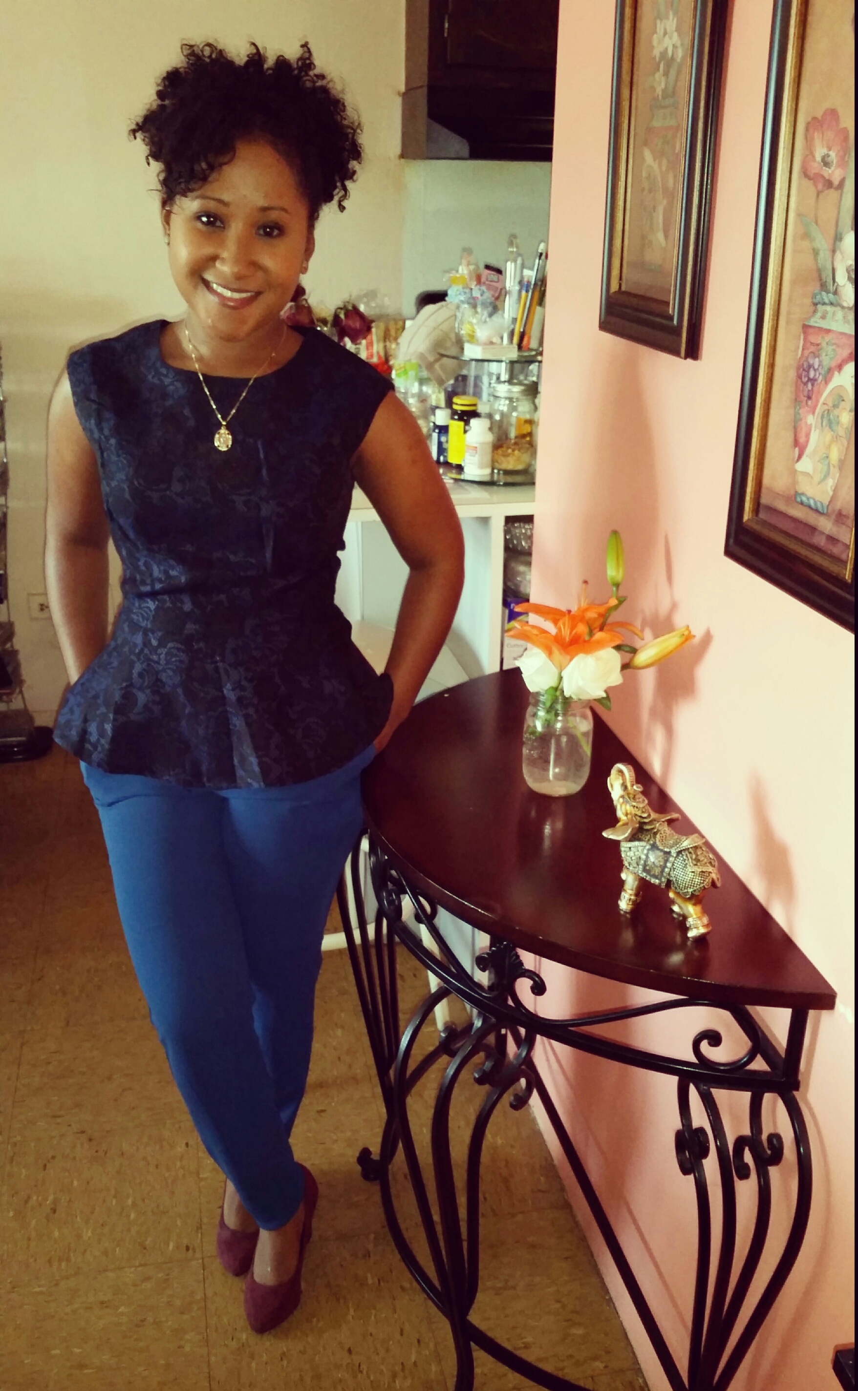 This I wore on Easter to church. I love peplum tops. They give the illusion of an itty bitty waist and disguise any midsection fat you wish to take attention away from. These pants are so comfortable, super flattering and elegant. I added this color shoe to add a wow factor to the outfit. I didn’t feel the need to add many accessories because I went for a classy clean look. The shirt itself had enough detail. I just left on my gold necklace which I pretty much use as daily wear when I do not feel like accessorizing.