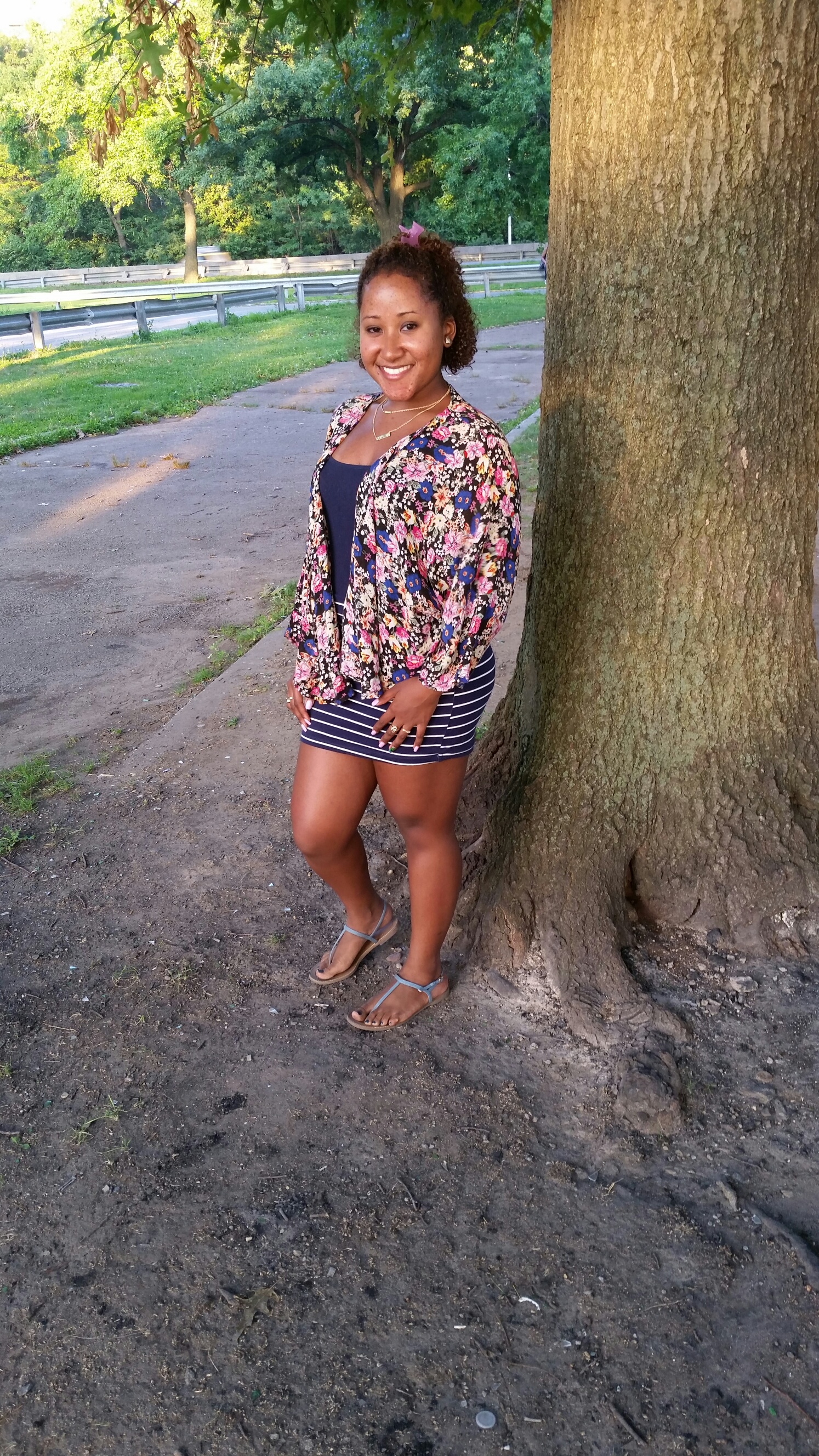 As it shows in this outfit I love playing around with prints and patterns. The skirt with the navy tank top would have worked fine but adding the colorful kimono brought the outfit to life. Since the top is the wow factor I kept it simple with denim sandals to continue the blue streak. Adding any other color would have been overwhelming.