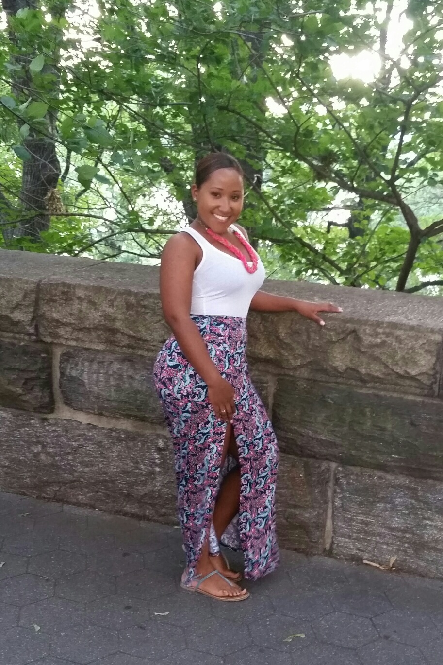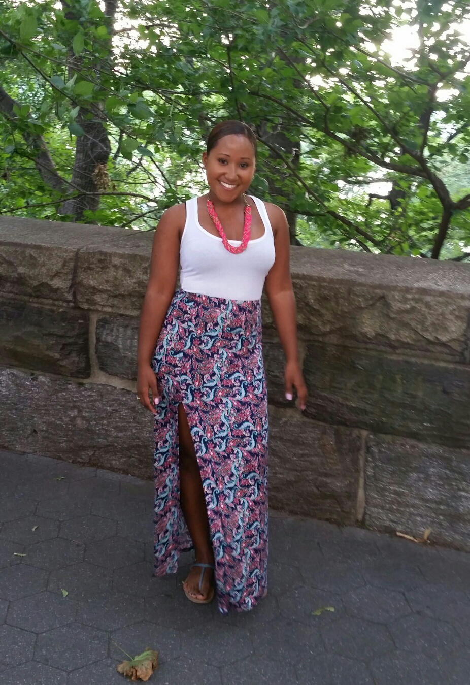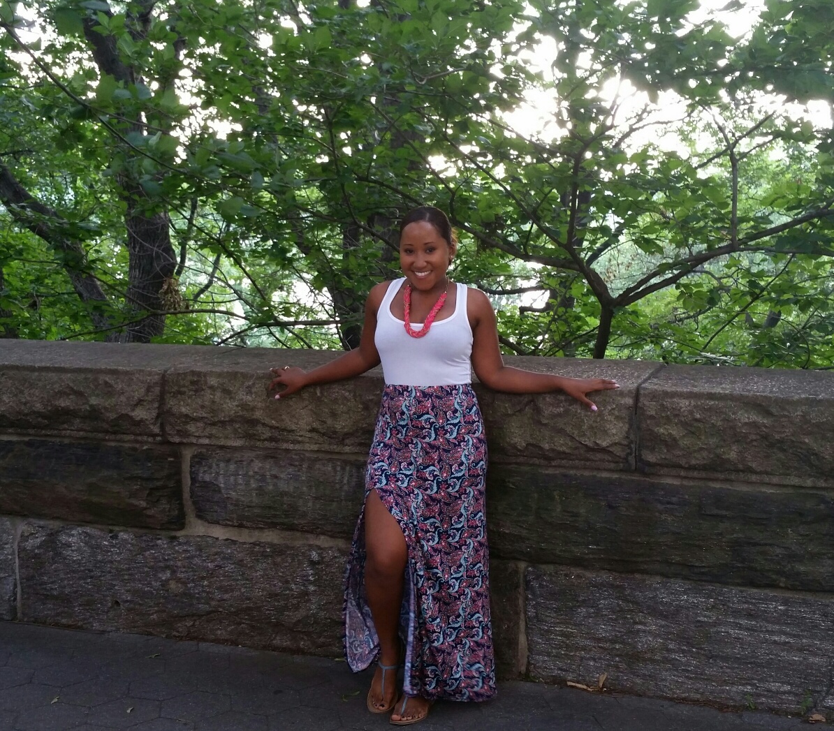 Floral prints and maxi skirts are in this summer making this skirt the best of both worlds. Because the skirt is so bold a plain shirt seemed most suitable. I felt the top was too boring which I resolved by integrating the necklace which complimented the pink in the skirt and balanced out the outfit.