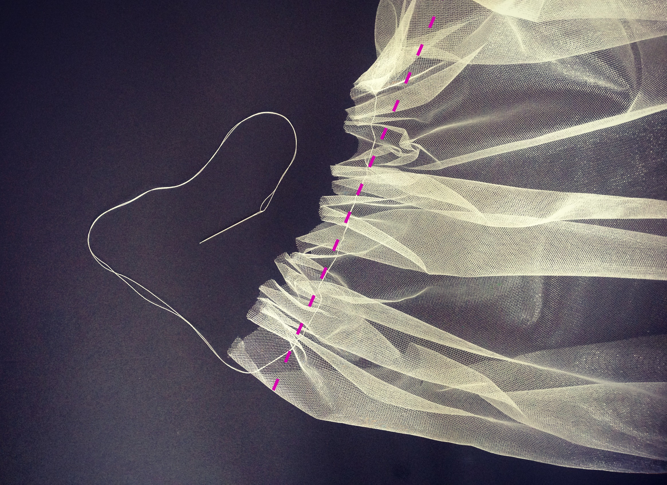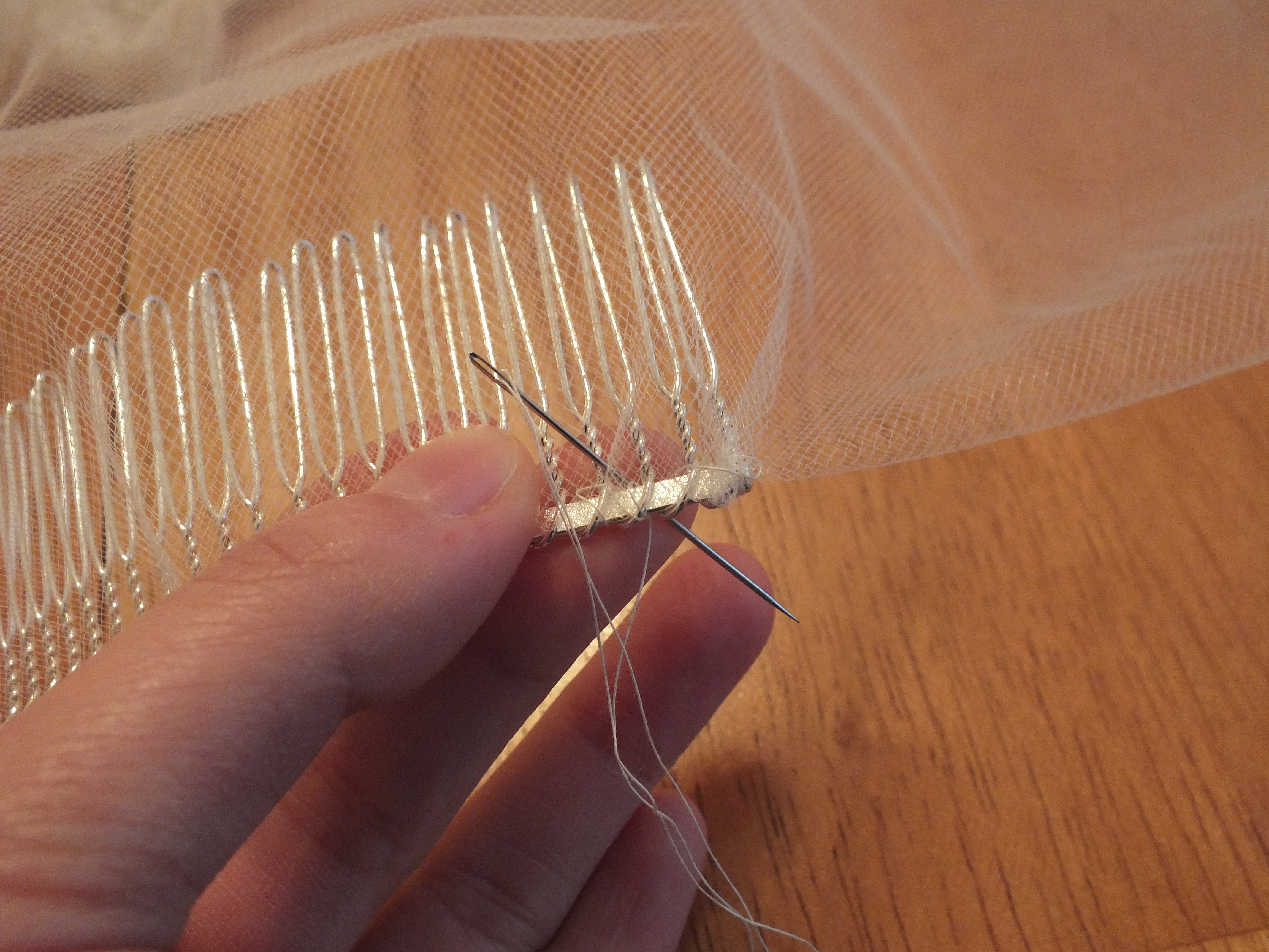 Step 6: hand sew the veil onto the hair pin (pass the needle and thread between each of the comb’s tooth)